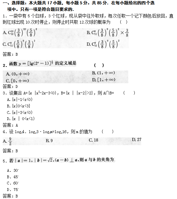 一、选择题(每题只有一个正确答案,请将正确答案填涂在答题卡正确位置上。17*5’=85’) 1.集合 A. B. C. D. 2.设甲:ABC是等腰三角形;乙:ABC是等边三角形,则甲是乙的 A.充分条件但不是必要条件 B.必要条件但不是充分条件 C.充分必要条件 D.既不充分也不必要条件