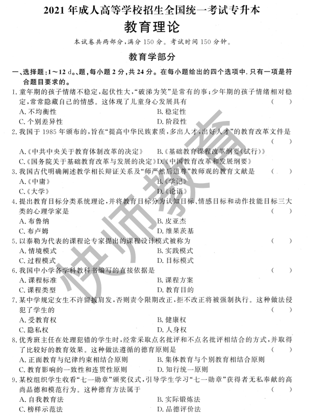 成人高考考试结束之后,网上也陆陆续续的公布了一些科目的真题及答案。快师教育安徽成考网根据考生提供的内容,将2021年成人高考专升本教育理论考试真题及答案整理并发布如下。由于题目都是网友根据回忆整理而来的,故仅供广大考生参考,如有疑问或想要提供更多科目真题的,可直接在线咨询。