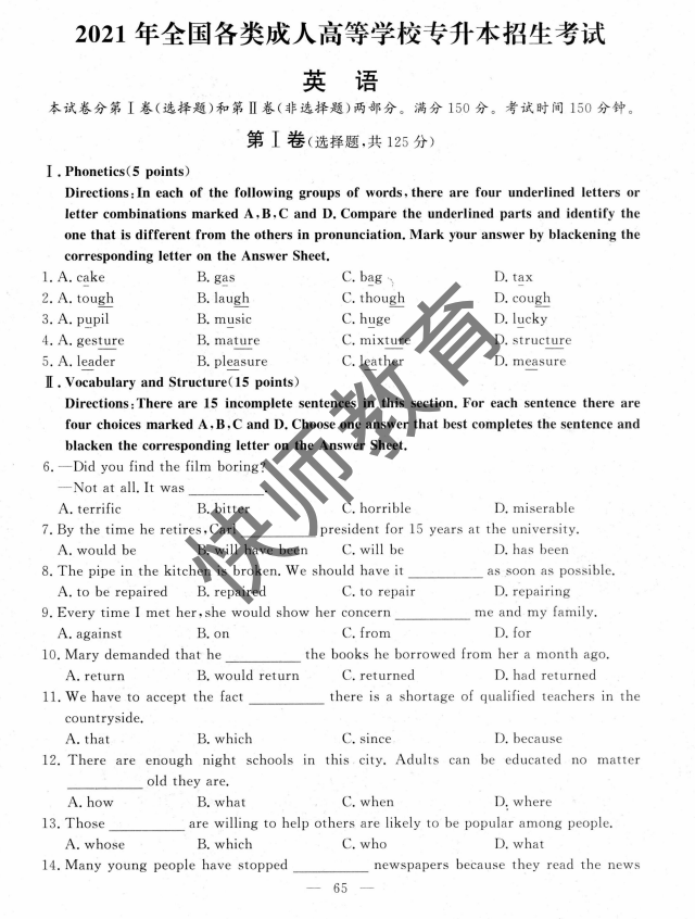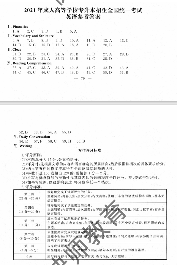 成人高考考试结束之后,网上也陆陆续续的公布了一些科目的真题及答案。快师教育安徽成考网根据考生提供的内容,将2021年成人高考专升本英语考试真题及答案整理并发布如下。由于题目都是网友根据回忆整理而来的,故仅供广大考生参考,如有疑问或想要提供更多科目真题的,可直接在线咨询。
